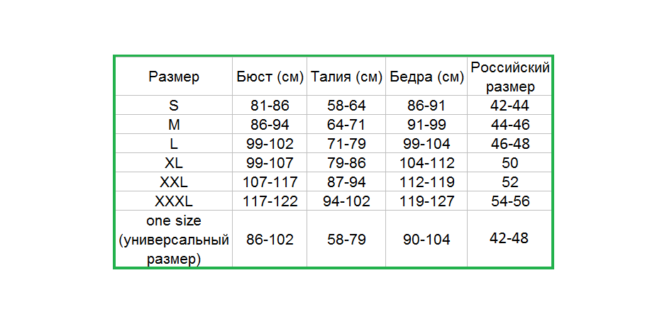 Таблица размеров